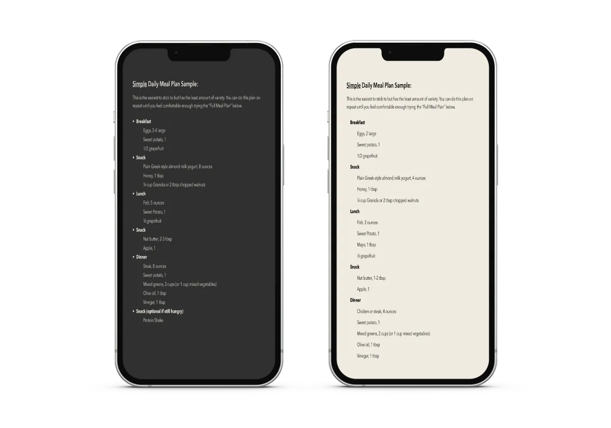 Our SIMPLE NUTRITION PLAN is an easy guide that will give you examples as to how to eat, and you can go customize it with your favorite proteins and ingredients.