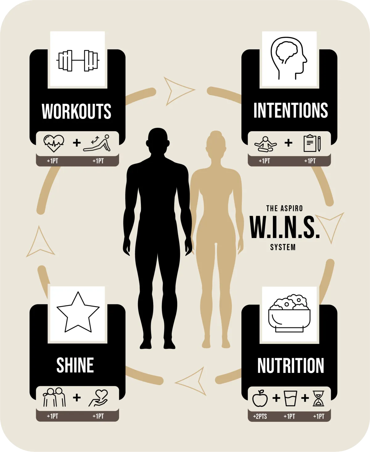 The W.I.N.S. Challenge™ was created for people who want to win their Workouts, win their Intentions, win their Nutrition and win their Shine by following a few simple and consistent activities each day…